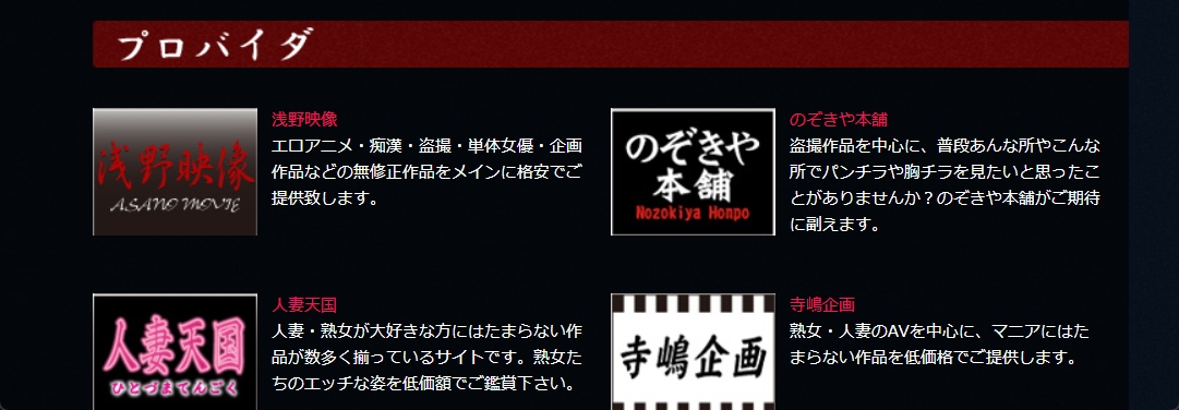 作品を提供しているプロバイダー7社で特徴は大ざっぱですが以下のような特徴の作品を提供しています。