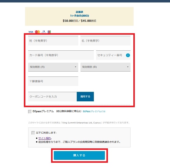 メールアドレスやクレジットカード情報など、契約に必要な個人情報を入力して下さい。